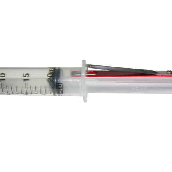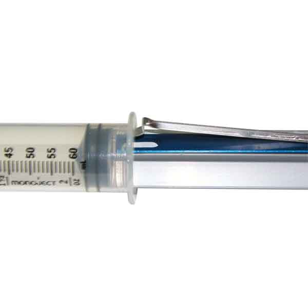 Syringe Click Lock made of Stainless Steel and Aluminum. Inserts into a syringe to lock plunger into position. Also known as snap locker, snapper lock. Autoclavable, reusable.